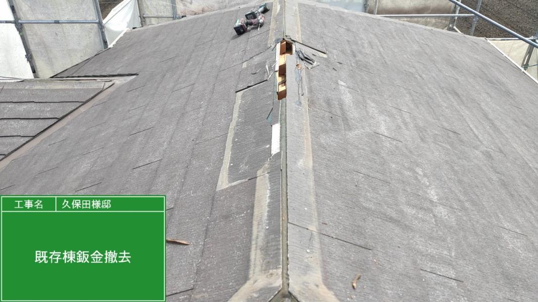 粘着ルーフィングを貼る前に屋根を綺麗に洗ってから棟板金を撤去します。